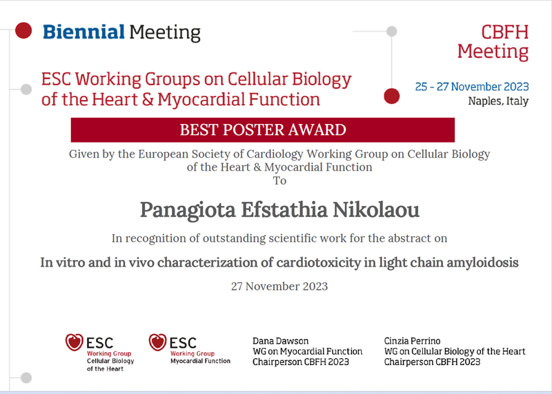 Award by the European Society of Cardiology Working Group on Cellular Biology of the Heart & Myocardial Function meeting in Napples, Italy, November 2023